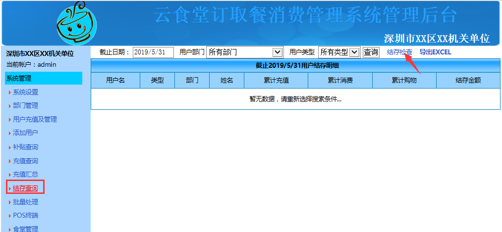 7.结存查询:可以查看用户消费、充值和余额的明细,可根据需要在顶部按照时间、部门、用户类型、精确的筛选查看,点击右上方的"结存检查"可查看用户的数据有无异常(如有异常可进行修复)。