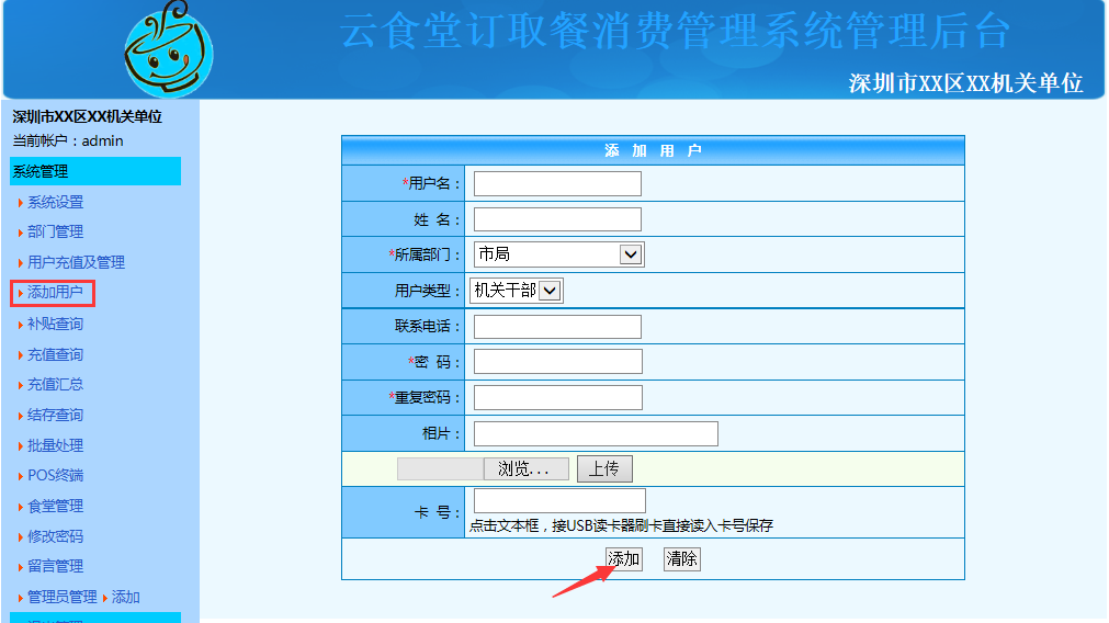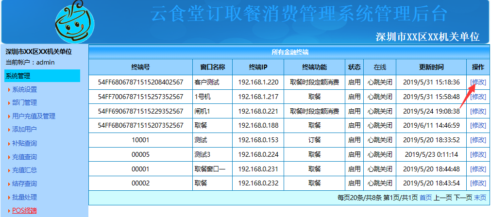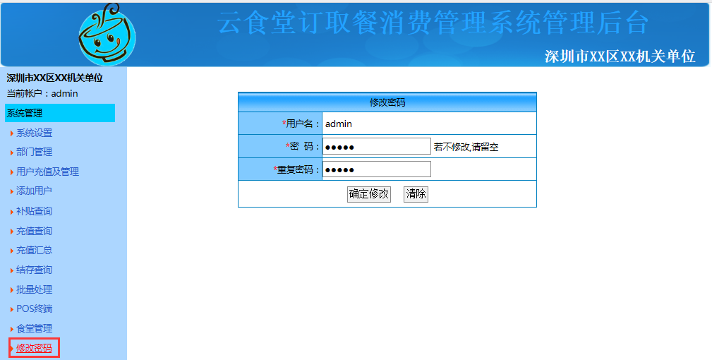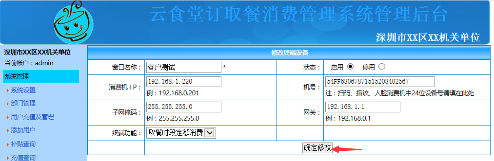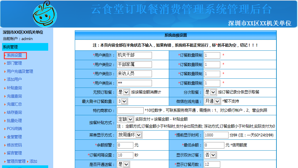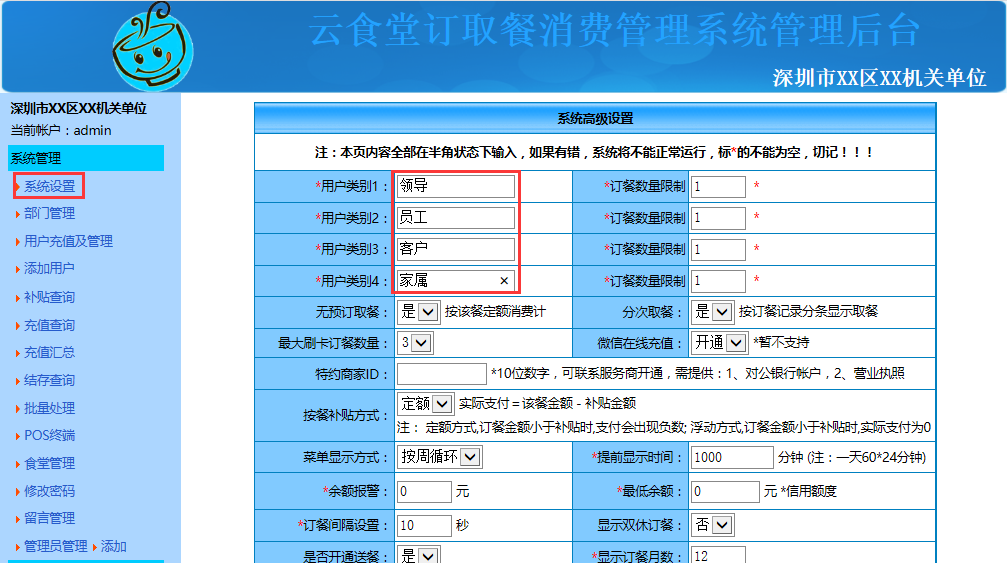 系统登录后点击"系统设置"可对用户类型、订餐数量限制(仅在需要订餐的情况下有效)、公告、用户最低余额(用户小于最低余额将不能登录、不能消费)、进行设置,设置好点击"确定修改"即可。