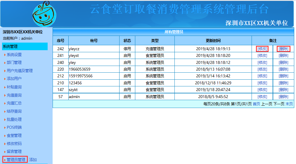 1.管理员的管理:点击系统导航栏中"管理员管理"可看到系统已有的管理员账号,还可以对其进行信息修改及删除。
