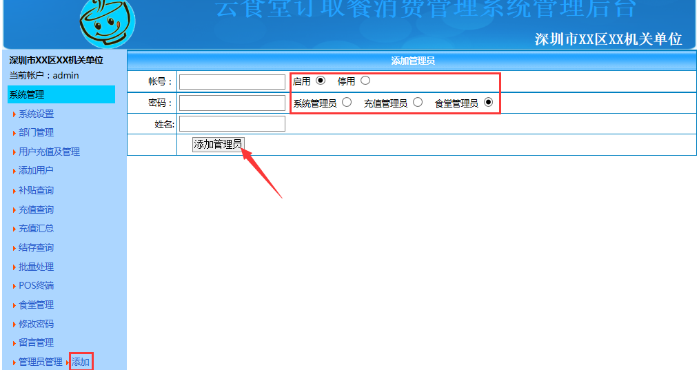 2.管理员的添加:在系统导航栏中点击管理员管理后面的"添加",填写并选择好相应的账号信息点击"添加管理员"即可。如下图: