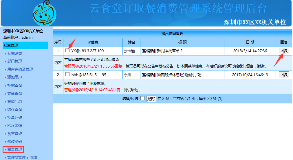 点击系统左边导航栏中的"留言管理"可对用户的留言信息进行管理,如下图: