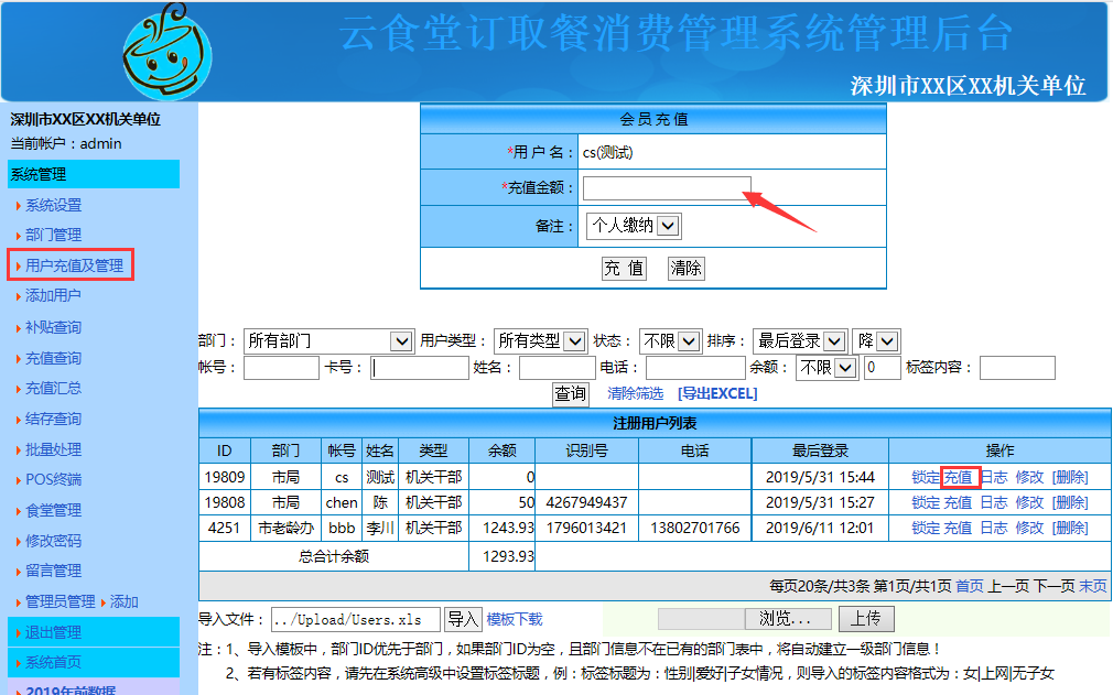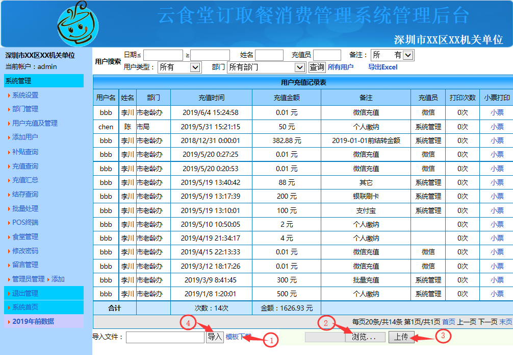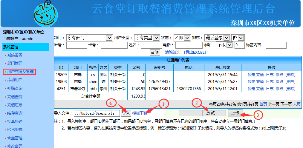 c.批量充值不同数额:点击左边系统导航栏中的"充值查询" 按照下图中先后顺序操作,先下载好模板按照模板格式录入用户充值信息(用户名单可从"用户及充值管理"处导出),然后再进入系统管理后台点击"选择文件"选择刚刚录入好用户充值信息表,再点击"上传",上传好后再点击"导入"即可完成批量用户不同数额的充值操作。如下图: