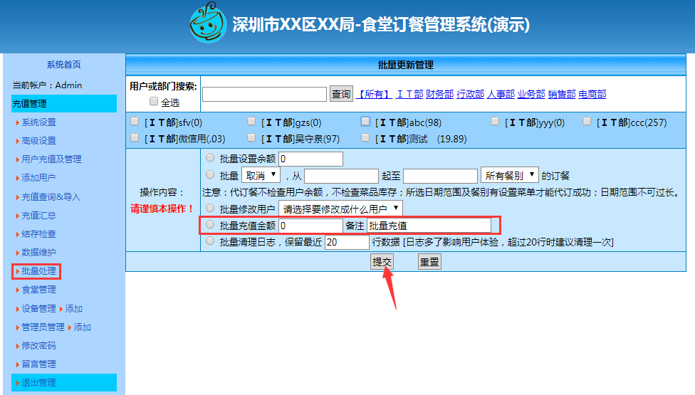 b.批量充值相同数额:在导航栏中点击"批量处理"先选择好需要充值的用户(可按需求在搜索栏精确查询,还可以点击搜索栏后方的蓝色字体根据需要进行筛选)点击用户前方的灰色方块表示选择。选择好用户后选中操作内容栏中的"批量充值"功能(点击相应功能前的灰色圆圈表示选择)点击提交即可。