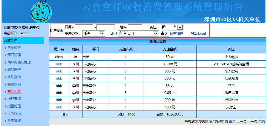 6.充值汇总:点击左边系统导航栏中的"充值汇总"查看用户的充值信息,可根据需要在顶部按照时间、部门、用户类型、姓名进行精确的筛选查看。如下图: